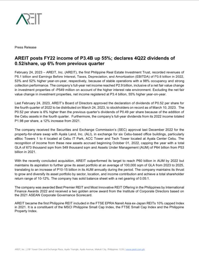 That 12% dividend increase compared to 2021 happens to be higher than the inflation rate. So AREIT investors have not lost their purchasing power if you only consider the dividend income. These are real returns on your money.