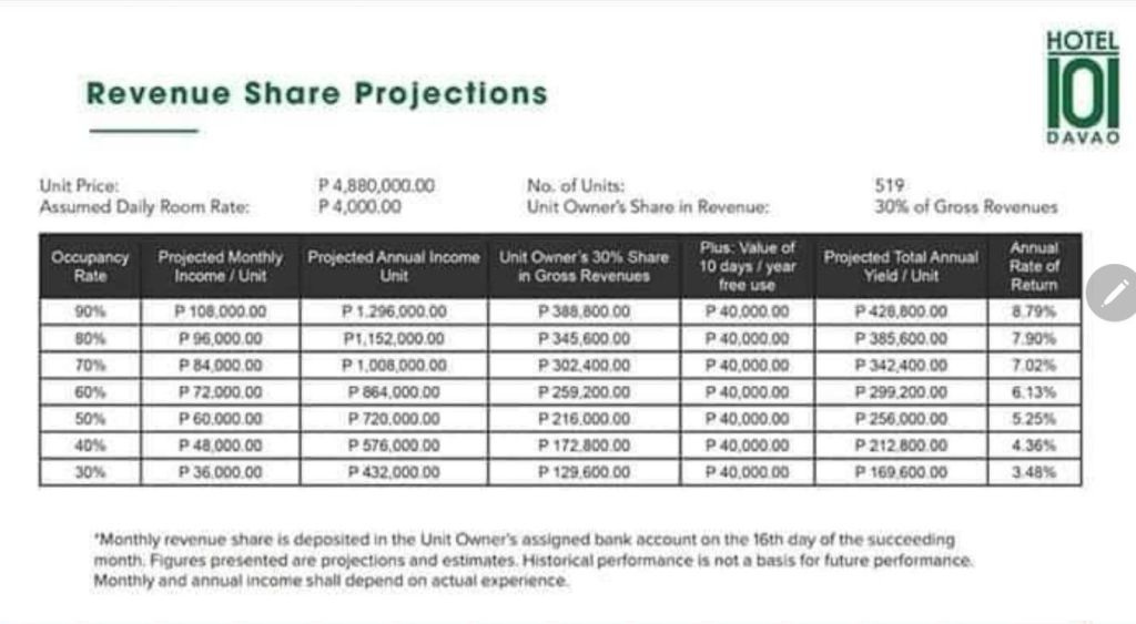 The video showed a projected annual ROR of 5.6% at 65% occupancy for Citadines Davao. Another upcoming condotel in Davao is Hotel 101 which shows a more optimistic projected ROR of 6.13% at 60% occupancy as seen in the table above. I also came accross a condotel from Megaworld in San Vicente, Palawan called Paragua Sands and their projected annual ROR is around the 5% mark as well.