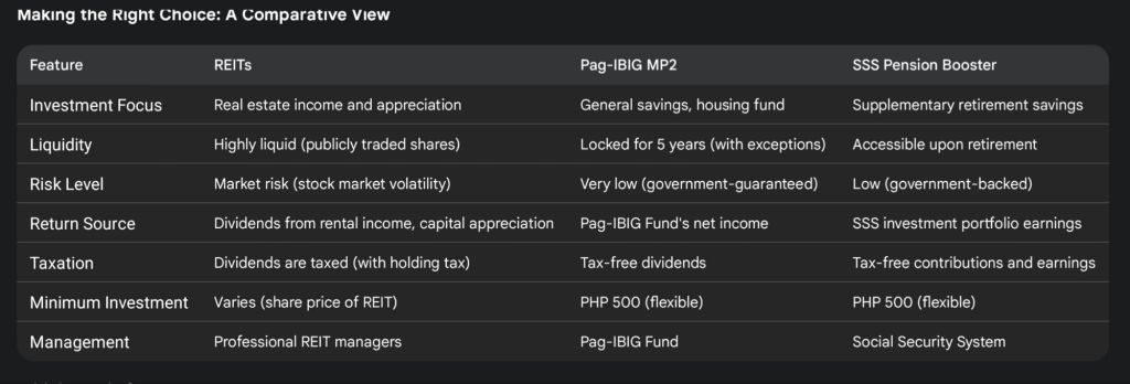 Filipino investors today are presented with a growing array of options to earn passive income. Among the most popular are Real Estate Investment Trusts (REITs), the Pag-IBIG MP2 Savings Program, and the SSS Pension Booster. While all offer compelling benefits, understanding their distinct characteristics can help you make an informed decision aligned with your financial goals.